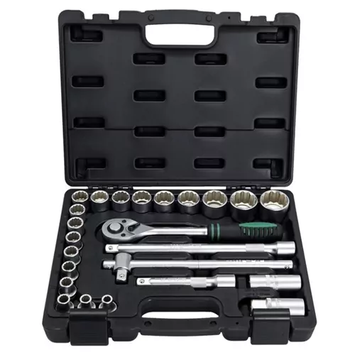 O Jogo de soquete estriado de 8 a 32 mm com encaixe de 1/2″ Stels, contém 24 peças de alta qualidade produzidas em aço cromo vanádio. Inclui soquetes estriados de 8 a 32 mm, extensão, cabo T, chave catraca, todos com encaixe de 1/2″. Produto de qualidade com bom preço!